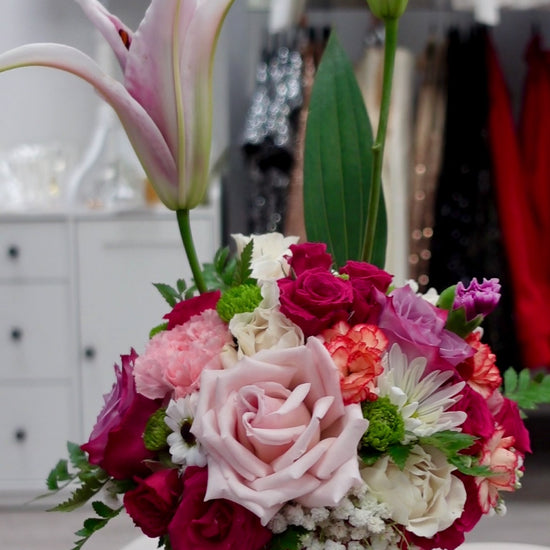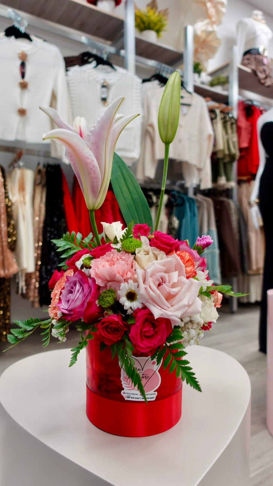 A vibrant mix of lilies, roses, carnations, and seasonal blooms arranged in a bold red box. Designed to express affection with color and elegance, this piece brings a touch of romance to any moment. Perfect for anniversaries, birthdays, or as a heartfelt surprise.