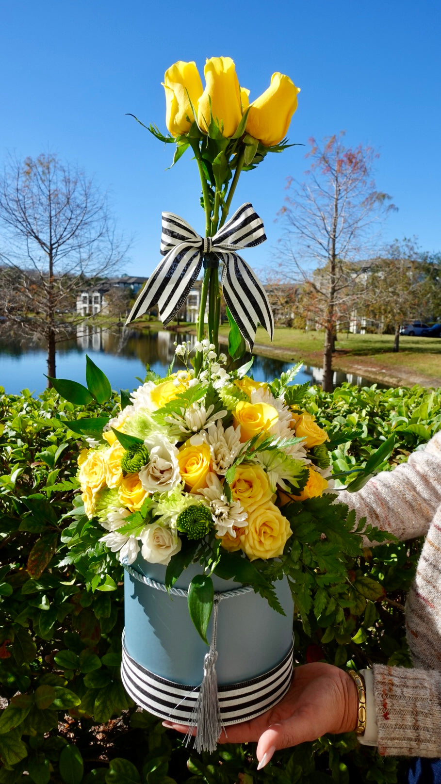 Botanic Crest features premium yellow roses, crisp white blooms, and fresh greenery arranged in a sky blue hatbox accented with a striped ribbon. The elevated trio of roses adds height and distinction, creating a modern, structured look. Perfect for birthdays, congratulations, corporate gifting, or any moment that calls for elegance with character.