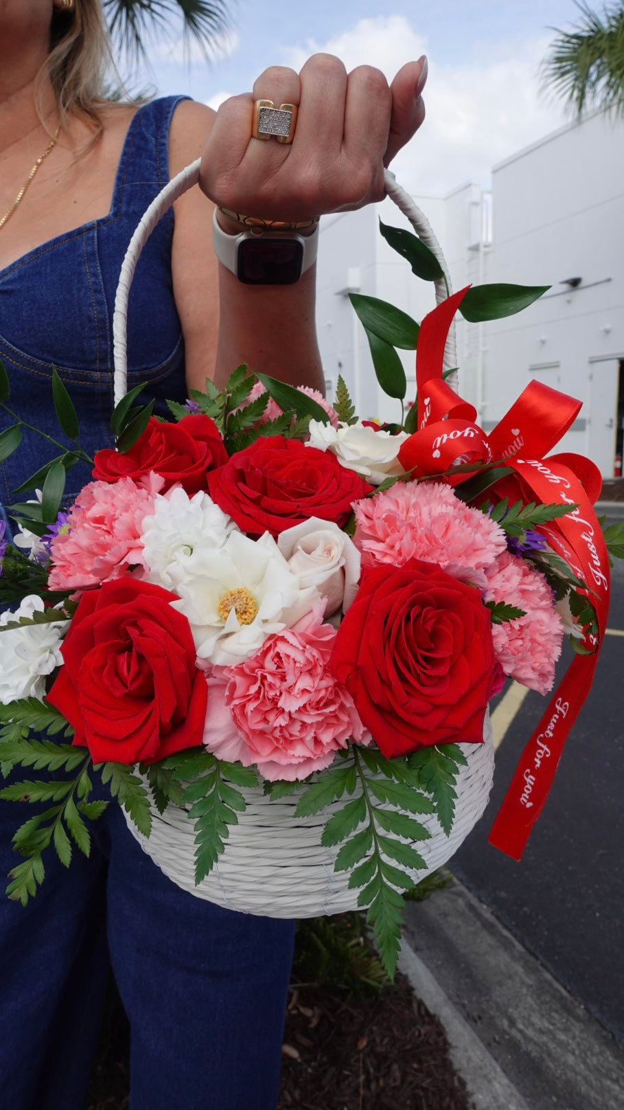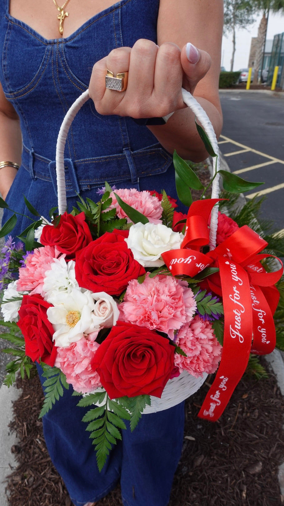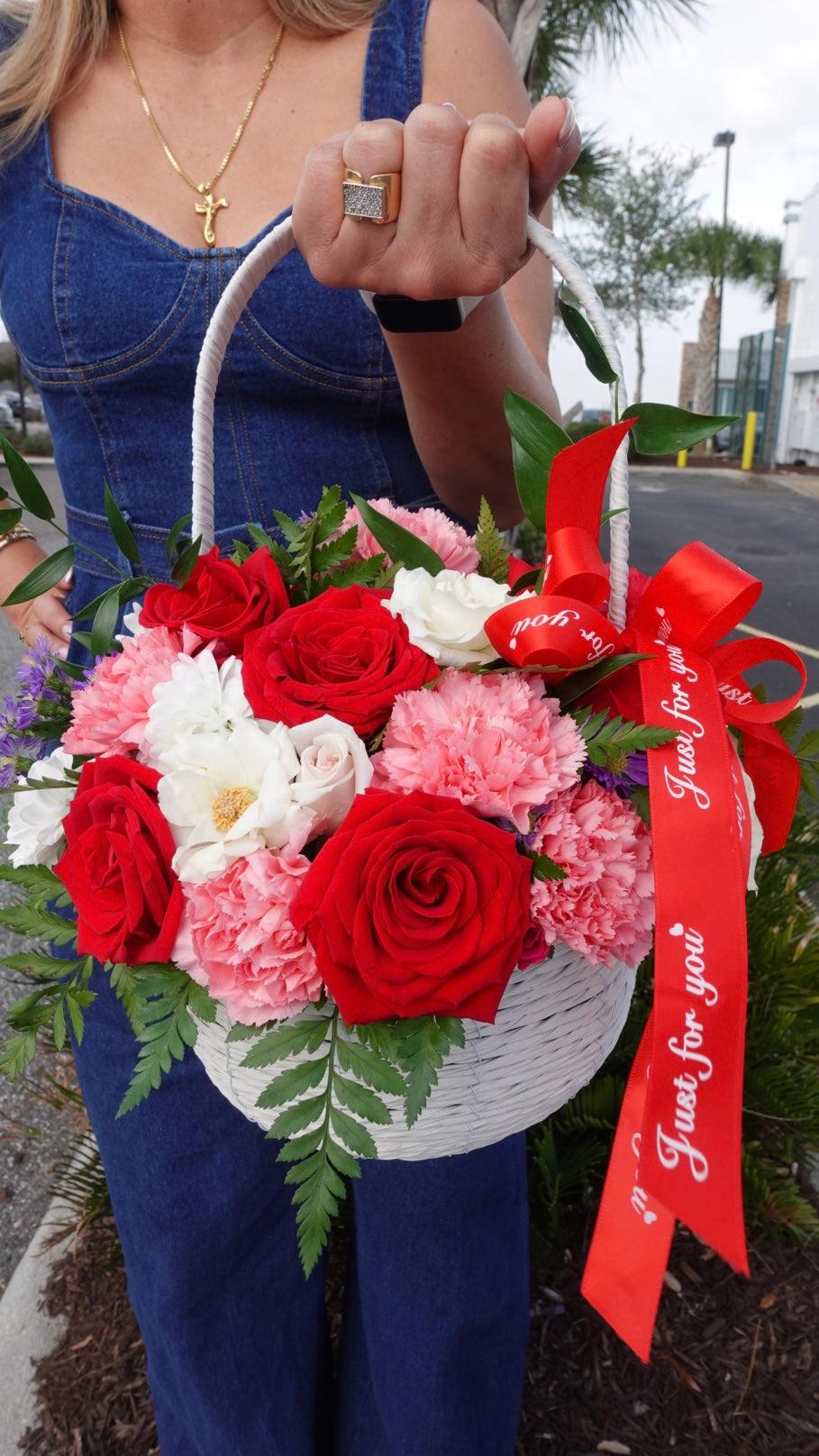 A romantic mixed-flower basket featuring red roses, blush carnations, white blooms, and delicate fillers arranged in a woven white base. Accented with fresh greenery and finished with a “Just for you” ribbon, this piece delivers a warm, heartfelt touch for any special moment