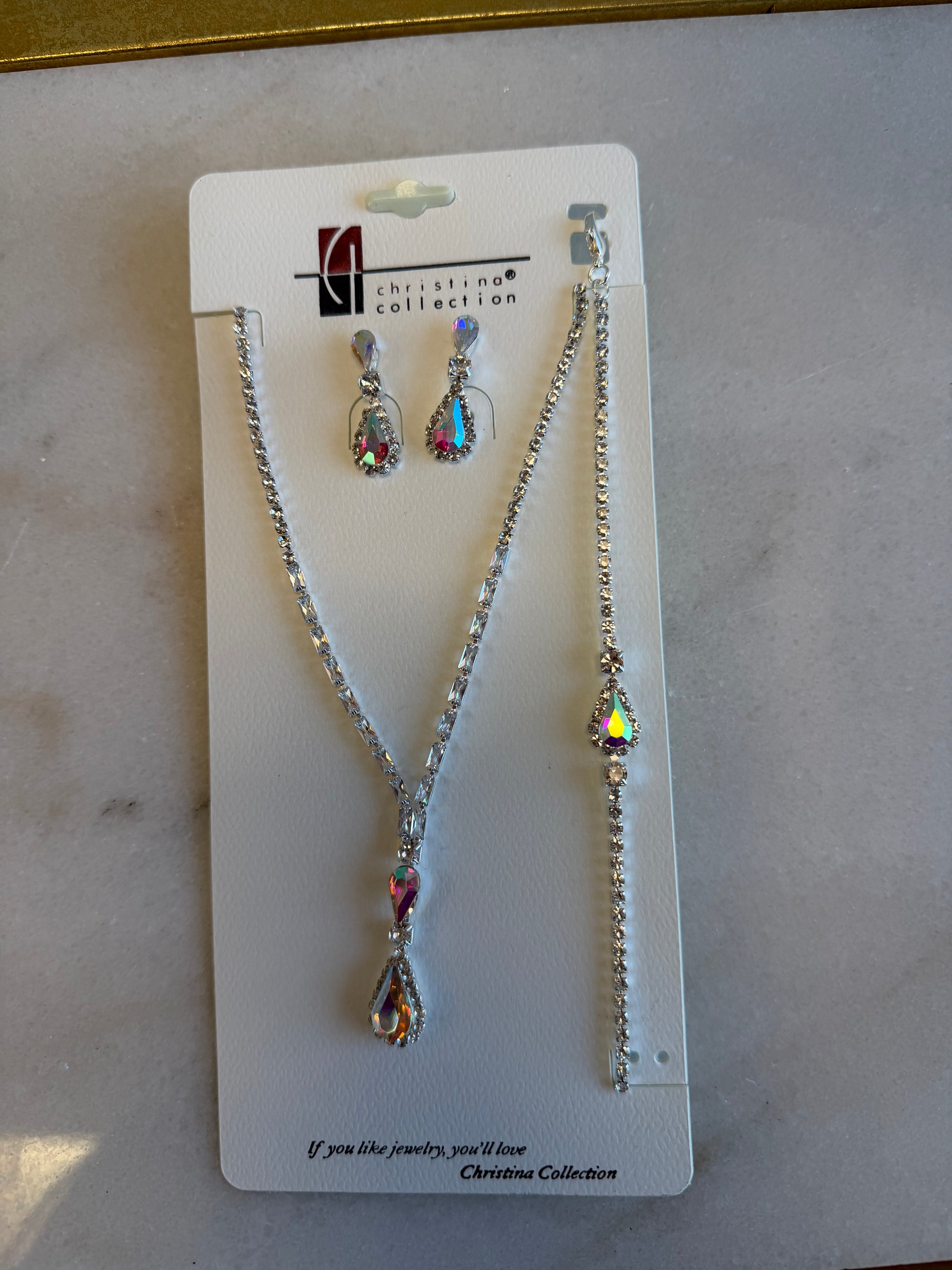 This crystal tear jewelry set includes a necklace, bracelet and earrings. Crafted from high-quality material, this set showcases a delicate design that adds a touch of elegance to any outfit. Perfect for any occasion, this set is a must-have for any jewelry collection.