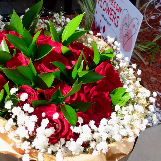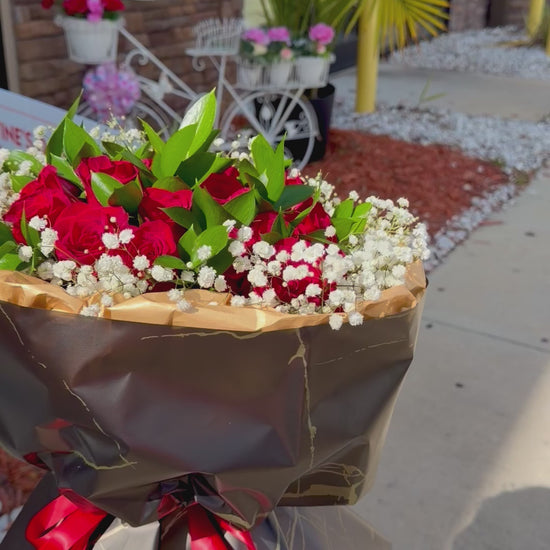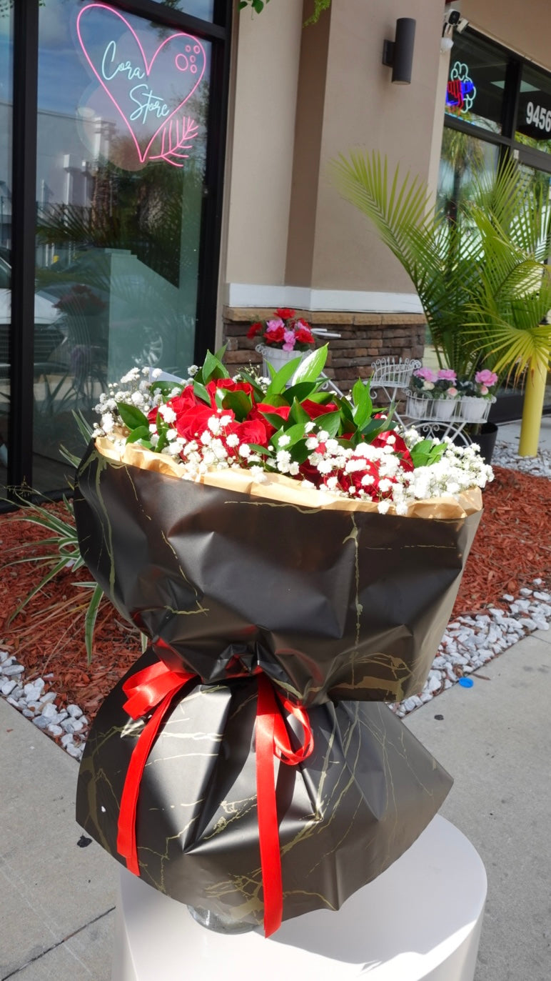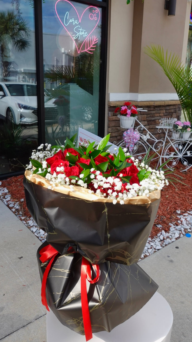 A striking bouquet of 20 premium red roses, wrapped in elegant black and gold paper for a bold, romantic look. Ideal for Valentine’s Day, anniversaries, or any moment meant to make a powerful impression.