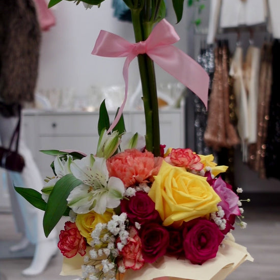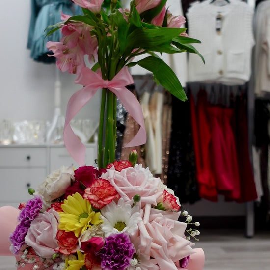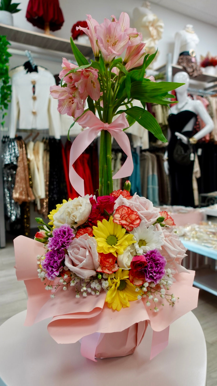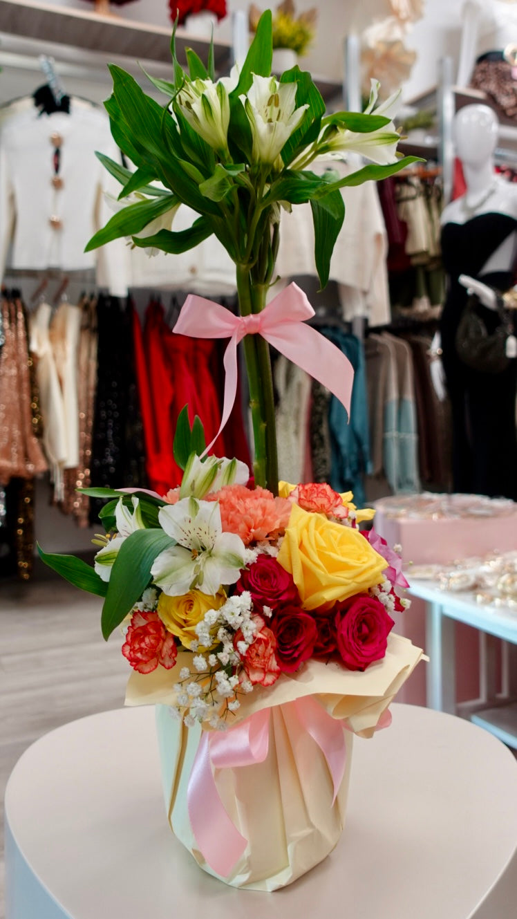 A tall central bloom rises gently above the mixed flowers, giving Petal Duo its signature balanced and modern look