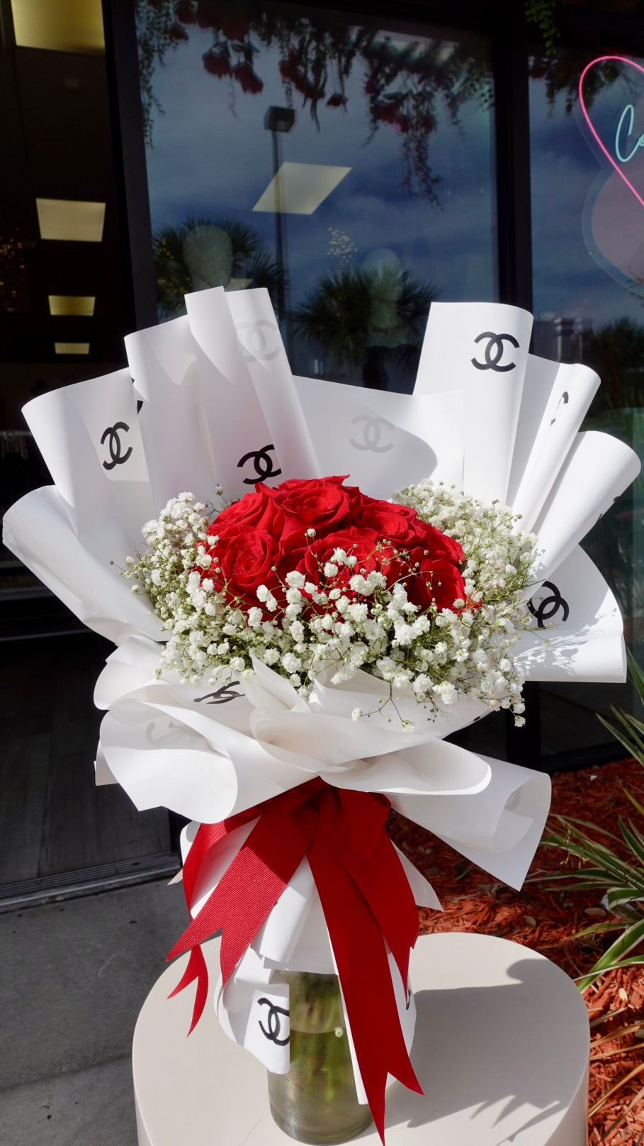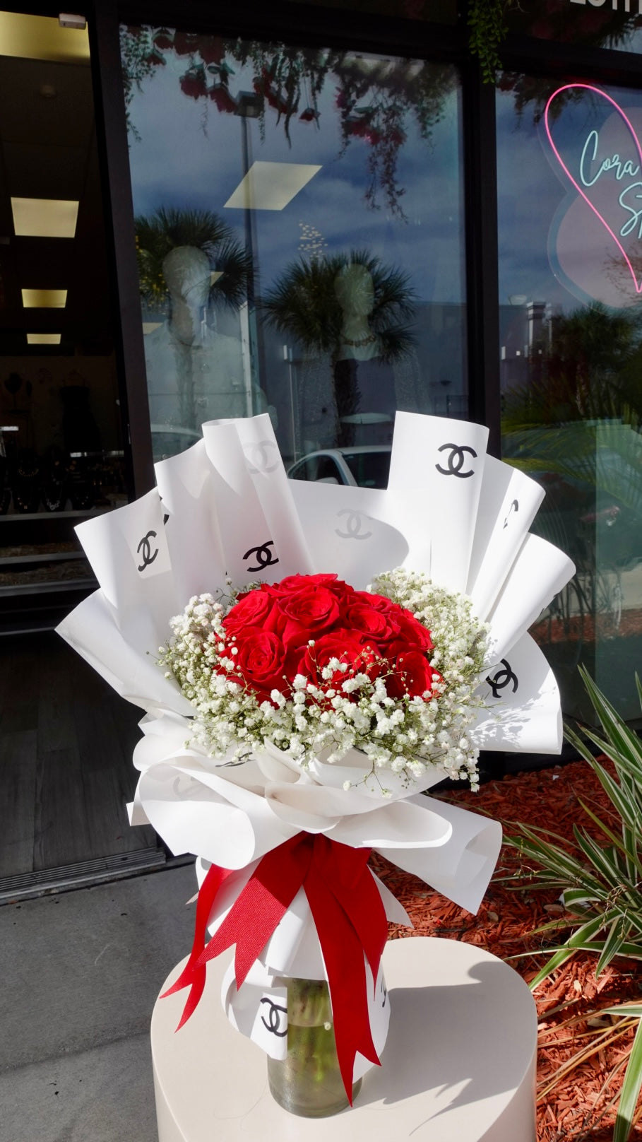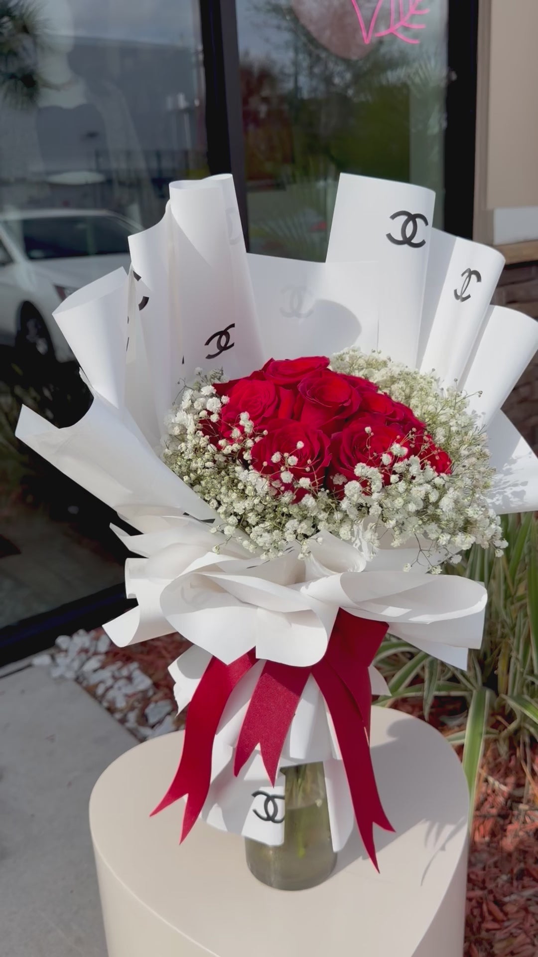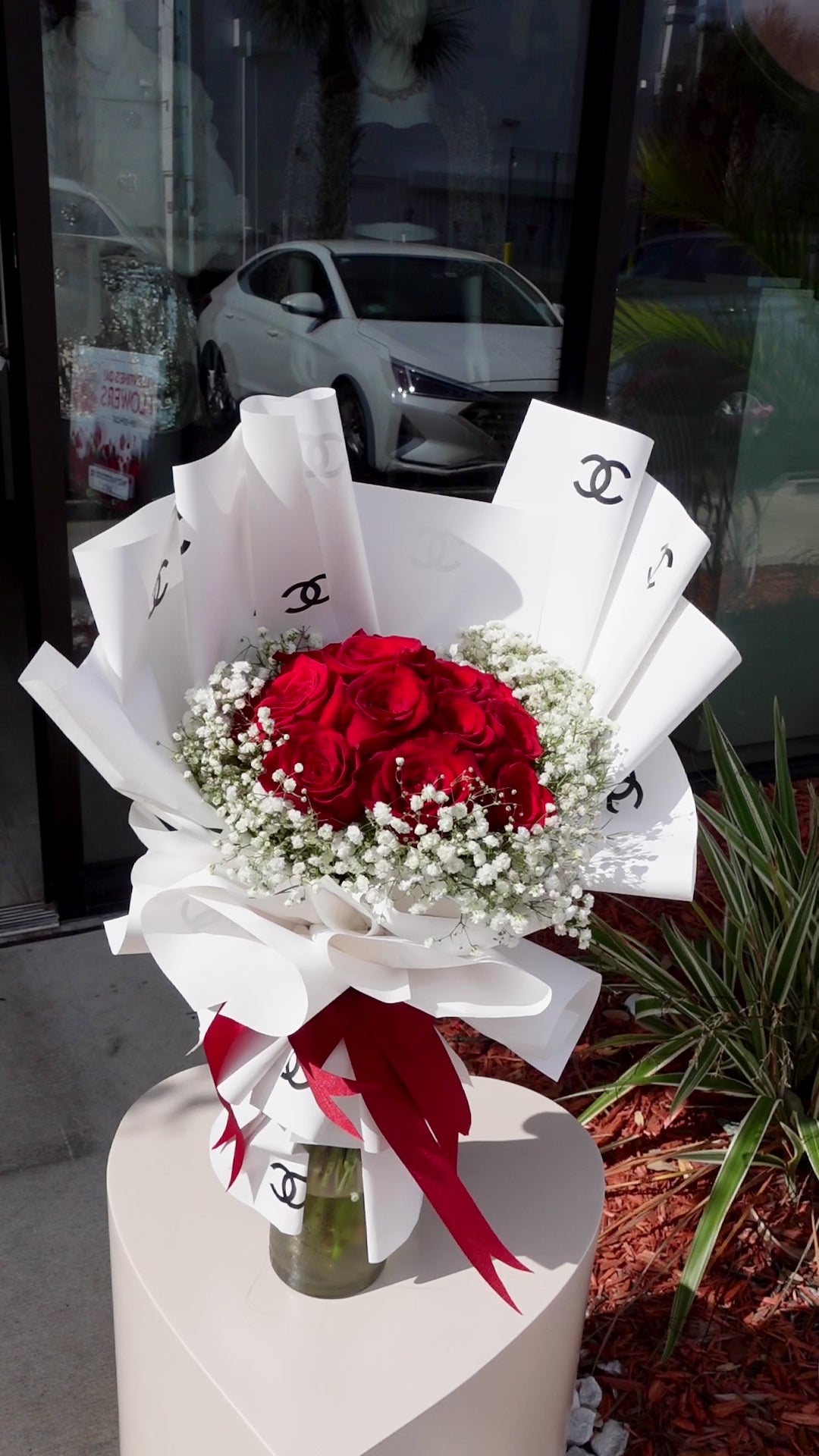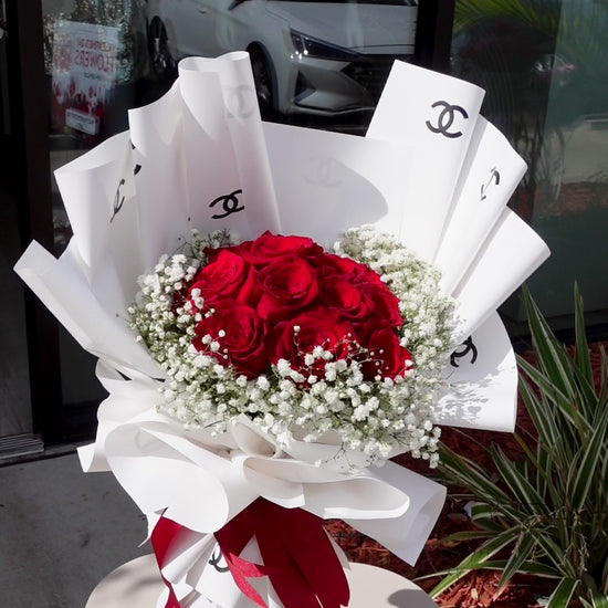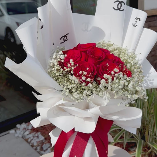 A refined arrangement of 15 premium red roses, paired with delicate white baby’s breath and wrapped in couture inspired details. A bold, luxurious statement designed to celebrate passion with timeless elegance.