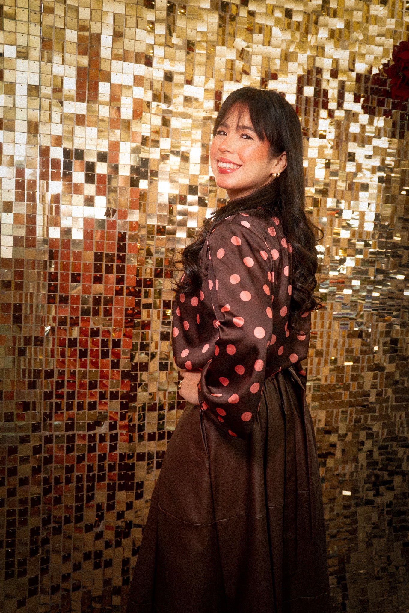 Discover refined elegance with this polka dot mock neck top in luxurious rosé and cocoa tones. The structured mock neckline adds sophisticated dimension, while the timeless dot pattern ensures versatile styling for any occasion. Crafted for those who appreciate understated luxury, this piece transitions effortlessly from professional settings to evening wear. The warm color palette flatters all complexions, making it an essential addition to a curated wardrobe that celebrates both style and substance.