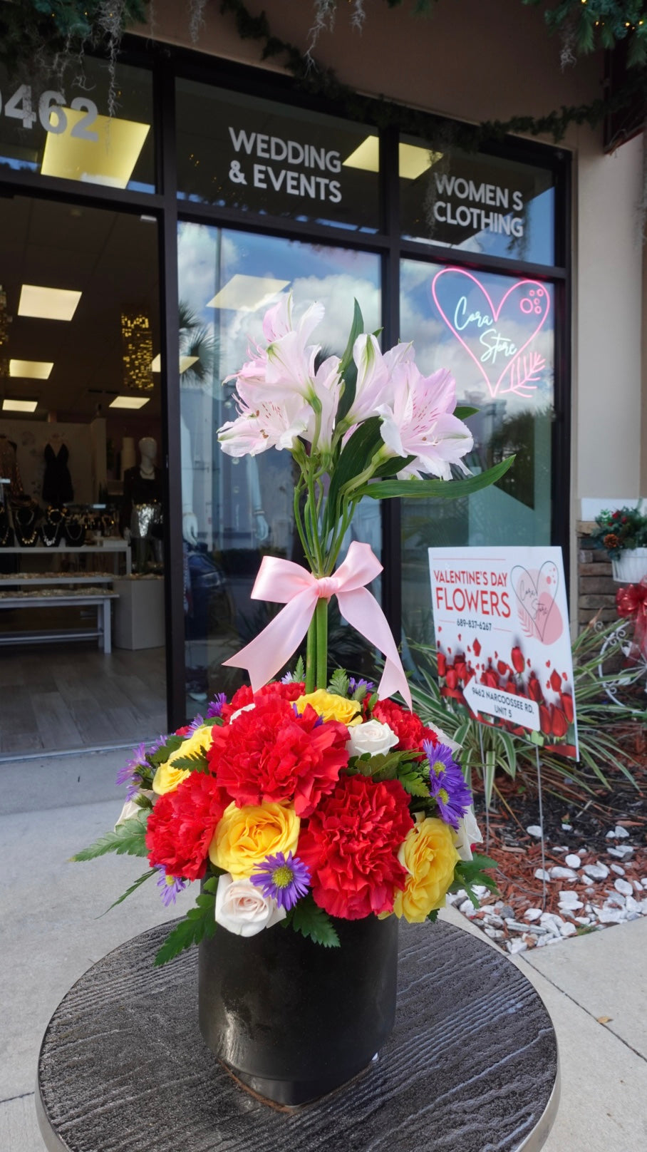Floral Lift brings height, color, and elegance together in one vibrant arrangement. Soft pink lilies rise above a rich mix of roses, carnations, and seasonal blooms, creating a bright, uplifting piece perfect for gifting or elevating any space.