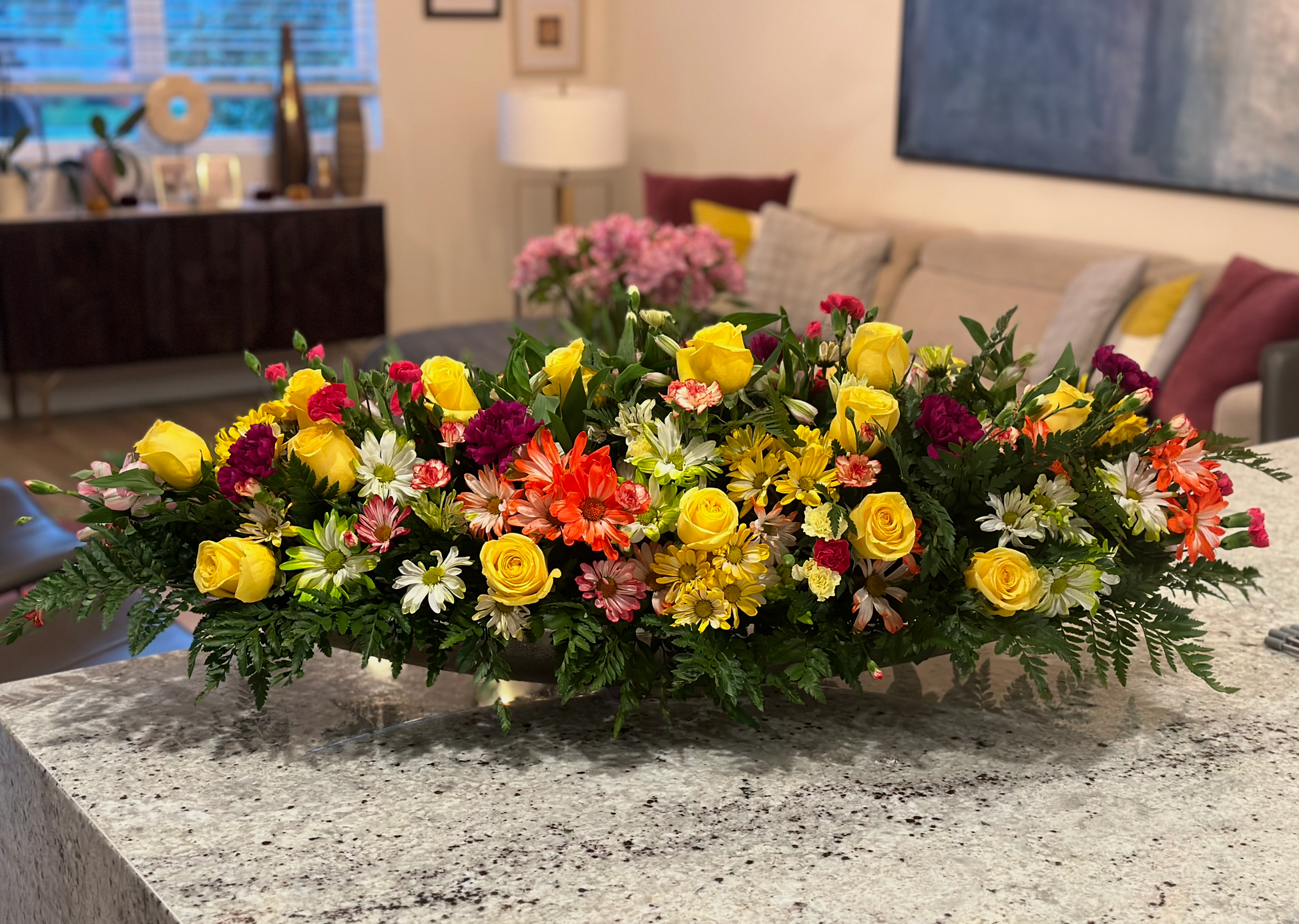 Bring color and elegance to any table with our Vibrant Floral Centerpiece. Designed with premium yellow roses, cheerful daisies, orange lilies, and seasonal blooms, this arrangement is perfect for creating a warm and festive atmosphere. Set in a lush bed of greenery, it’s ideal for dining tables, events, and special celebrations.