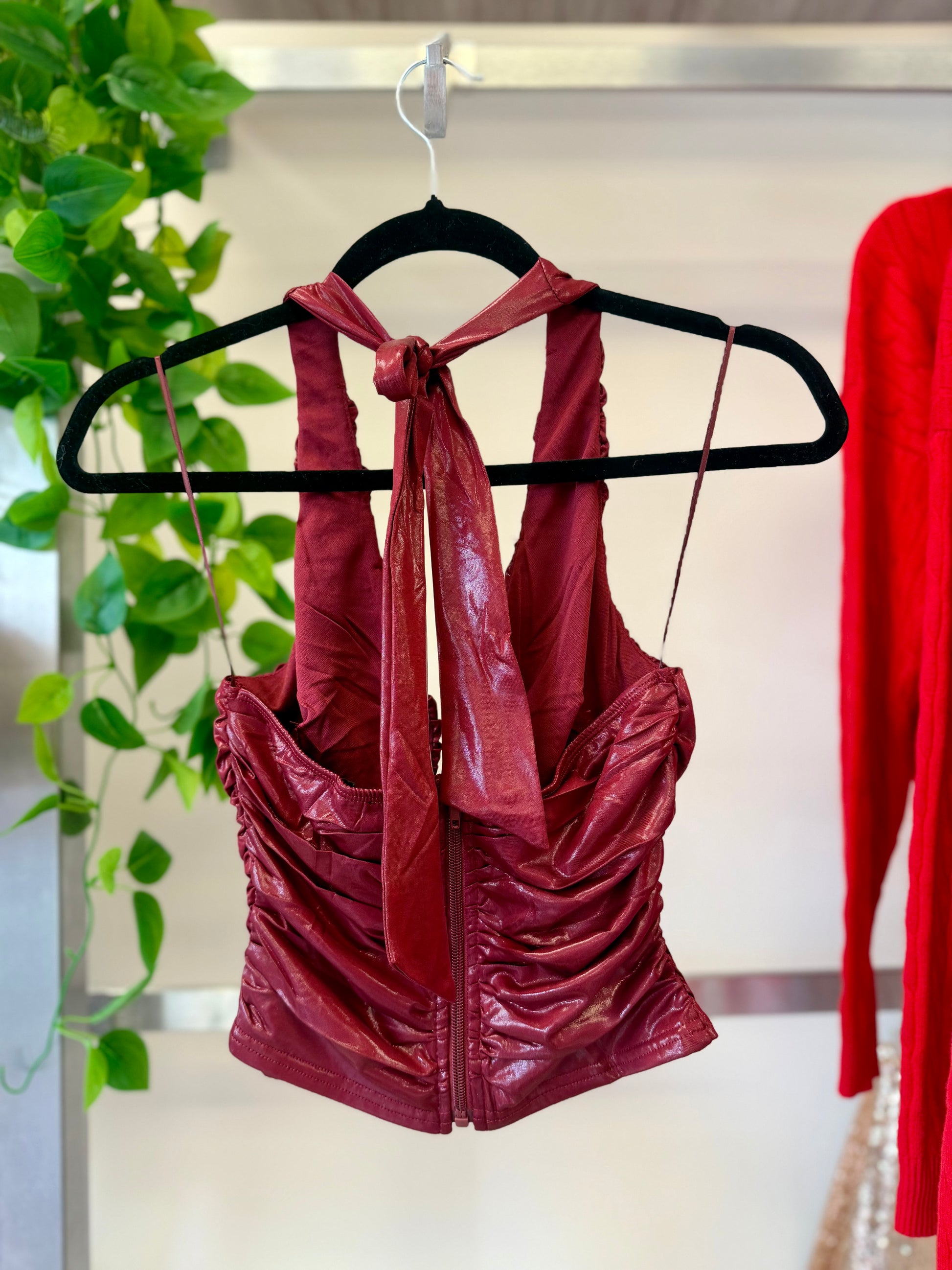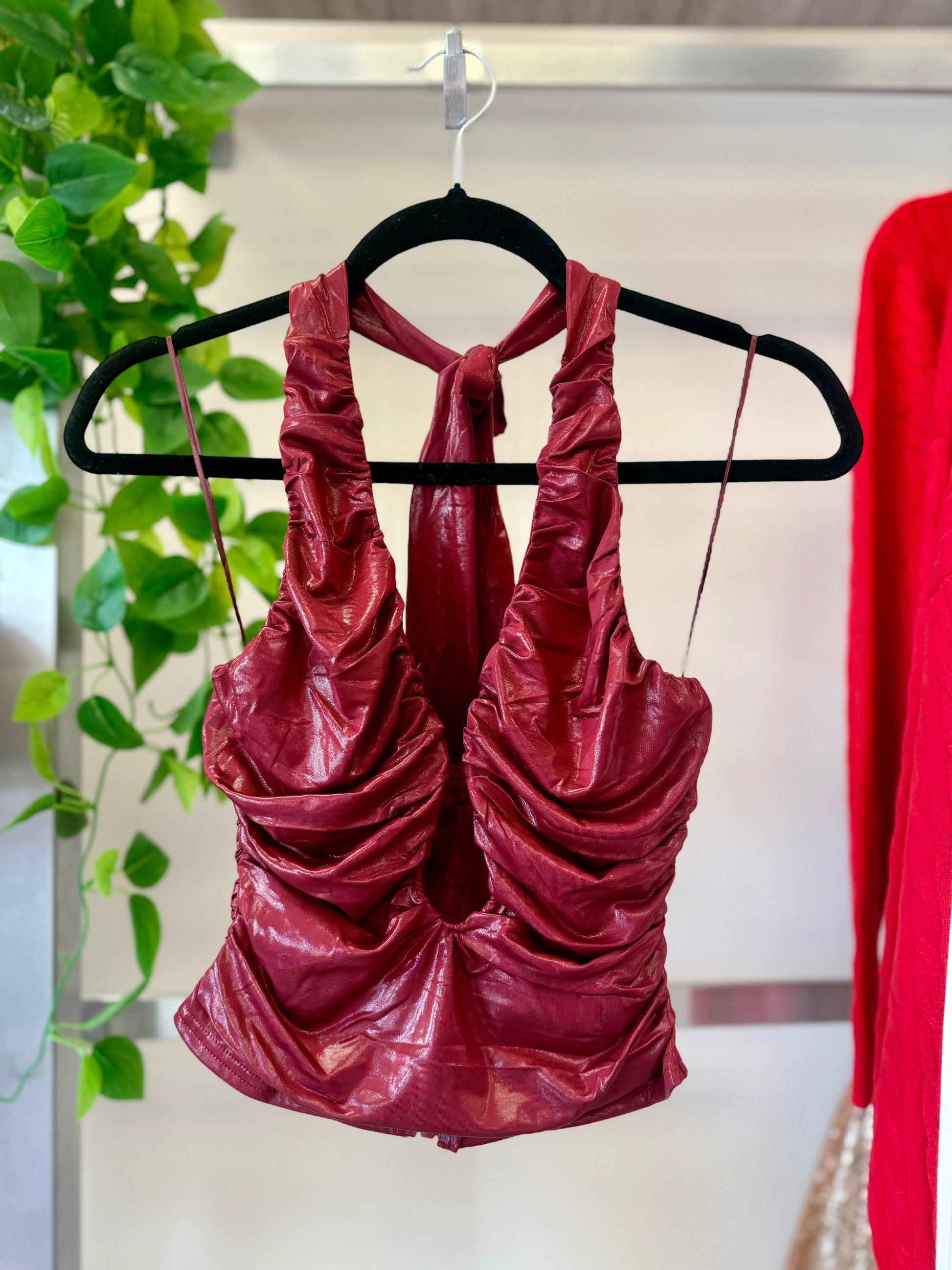 Indulge in the luxurious Wine Spark Top. Made with glossy material, this short top will add a touch of elegance to your wardrobe. Perfect for a night out or a special occasion, its unique design is sure to turn heads. Elevate your style with this exclusive piece.